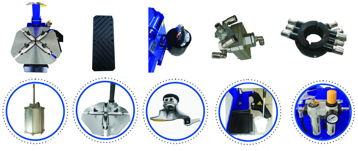 • 该机可选配拆装头保护套、保护垫、夹爪保护套、撬棍保护套和靠胎铲防护套。在拆装铝合金轮胎时不会划伤轮辋